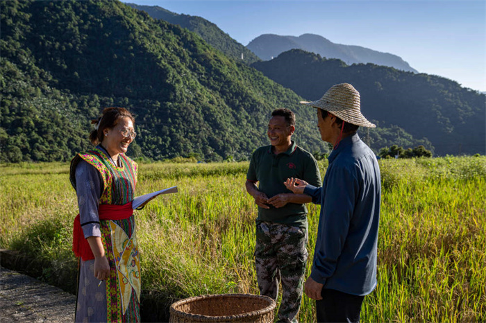在墨脱县德兴乡,乡党委副书记白玛曲珍(左)在田间调研(2023年10月13日摄)。新华社记者 孙非 摄